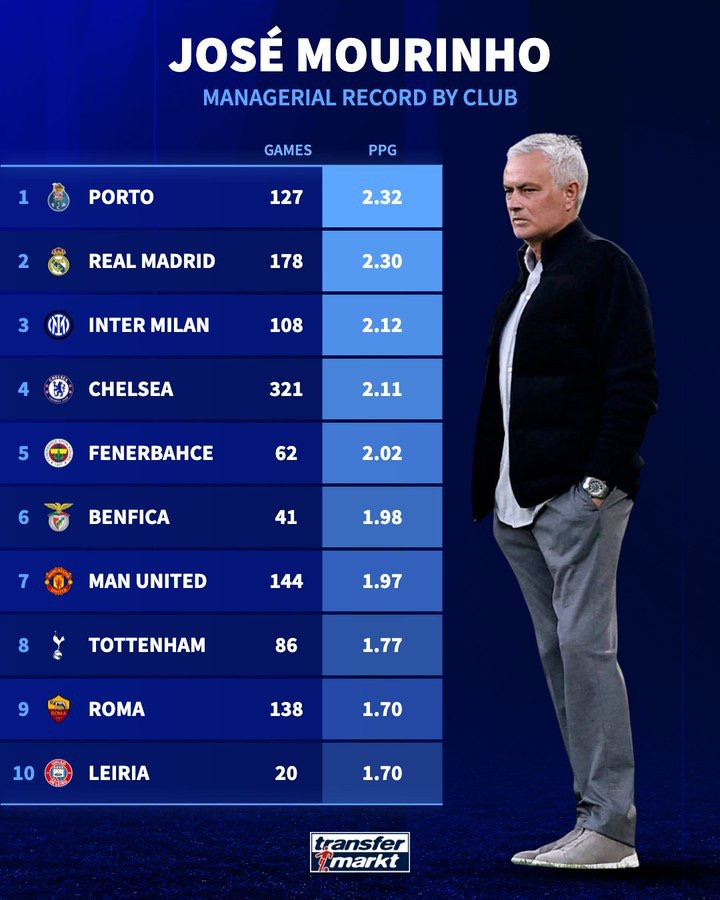 虎扑02月17日讯德转统计了穆里尼奥抓教各队场均得分榜。