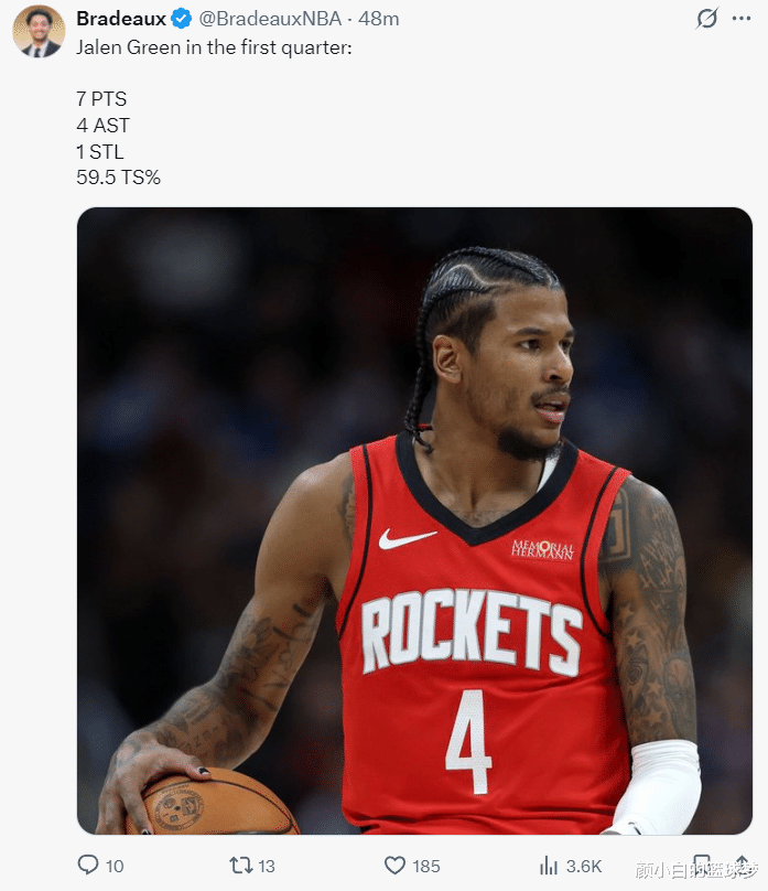 杰伦-格林在G1的进展很差,15中3,三分4中0,拿7分8篮板2助攻1伪善,射中率20%适度了活命首场季后赛。这场G2通盘东谈主齐在盯着他,因为仍是有好意思媒合计这个系列赛决定格林今夏的去留问题,格林也在个东谈主IG上发声来冲突质疑,首节他5中2+三分4中1拿到7分1篮板4助攻1抢断。